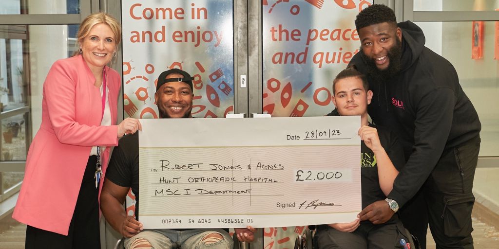 Fidel Thompson, who founded Breakin’ Barriers, donated £2,000 to the Midland Centre for Spinal Injuries (MCSI) Activity Fund alongside Craig Pinkney, from S.O.L.V.E – this year’s sponsor, as well as donating a gift to a patient and the Oswestry-based hospital.