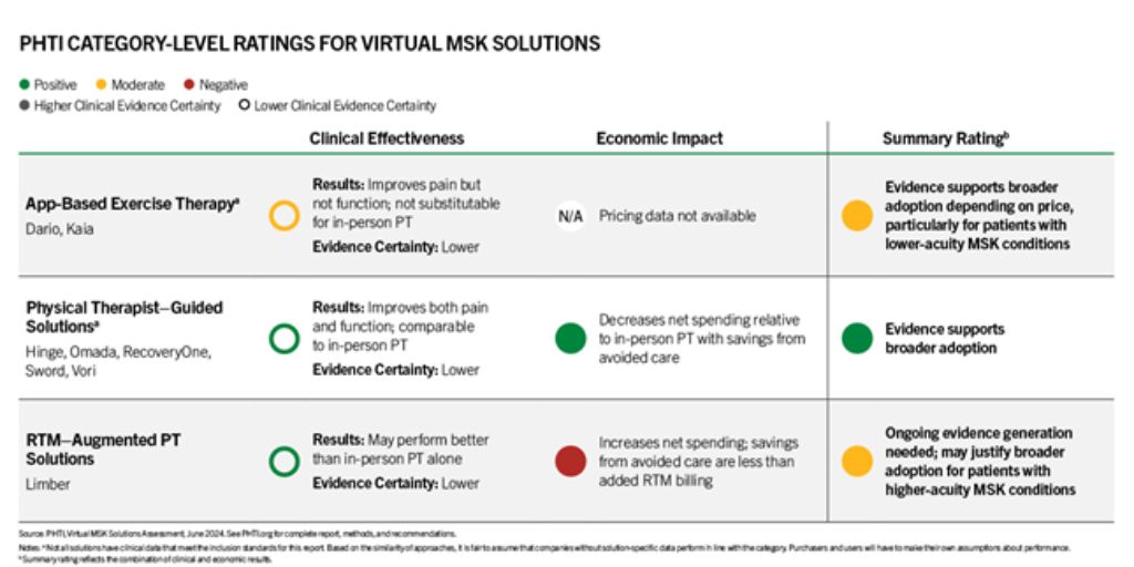 PHTI’s analysis uses an evidence-based framework and review of more than 2,000 articles, including 53 submitted to PHTI by companies evaluated in the report. PHTI received input from various experts and individuals, including licensed physical therapists, clinical advisors, MSK patients, and other stakeholders. PHTI’s findings on clinical effectiveness and economic impact—as well as combined summary ratings for each category of solutions—are summarized below: